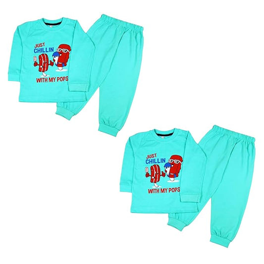 Sakuya Kids Cotton T -Shirt & Pant Set for Boys & Girls (Pack of 2)- Fun Cartoon Print Breathable Cotton Full Sleeve Unisex Kids Clothing Set - Nightwear coord Set-Blue