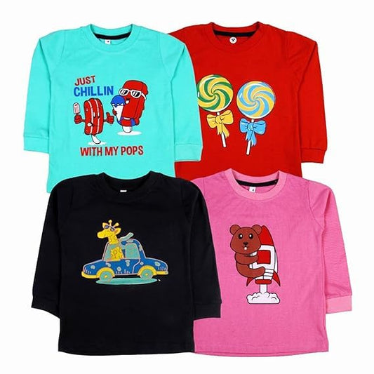 Sakuya Kids T-Shirt for Boys & Girls | Regular Fit Unisex Boy's Girl's Cotton Dress | Center Design Round Neck Tees | Full Sleeves Printed T-Shirts Pack of 4, Multicolour
