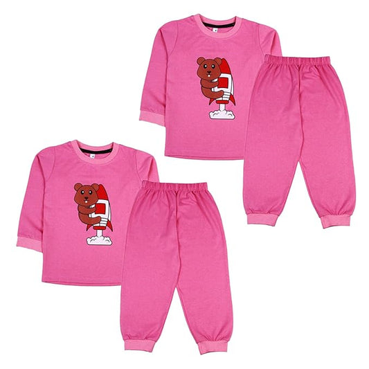Sakuya Kids Cotton T -Shirt & Pant Set for Boys & Girls (Pack of 2)- Fun Cartoon Print Breathable Cotton Full Sleeve Unisex Kids Clothing Set - Nightwear coord Set-Pink