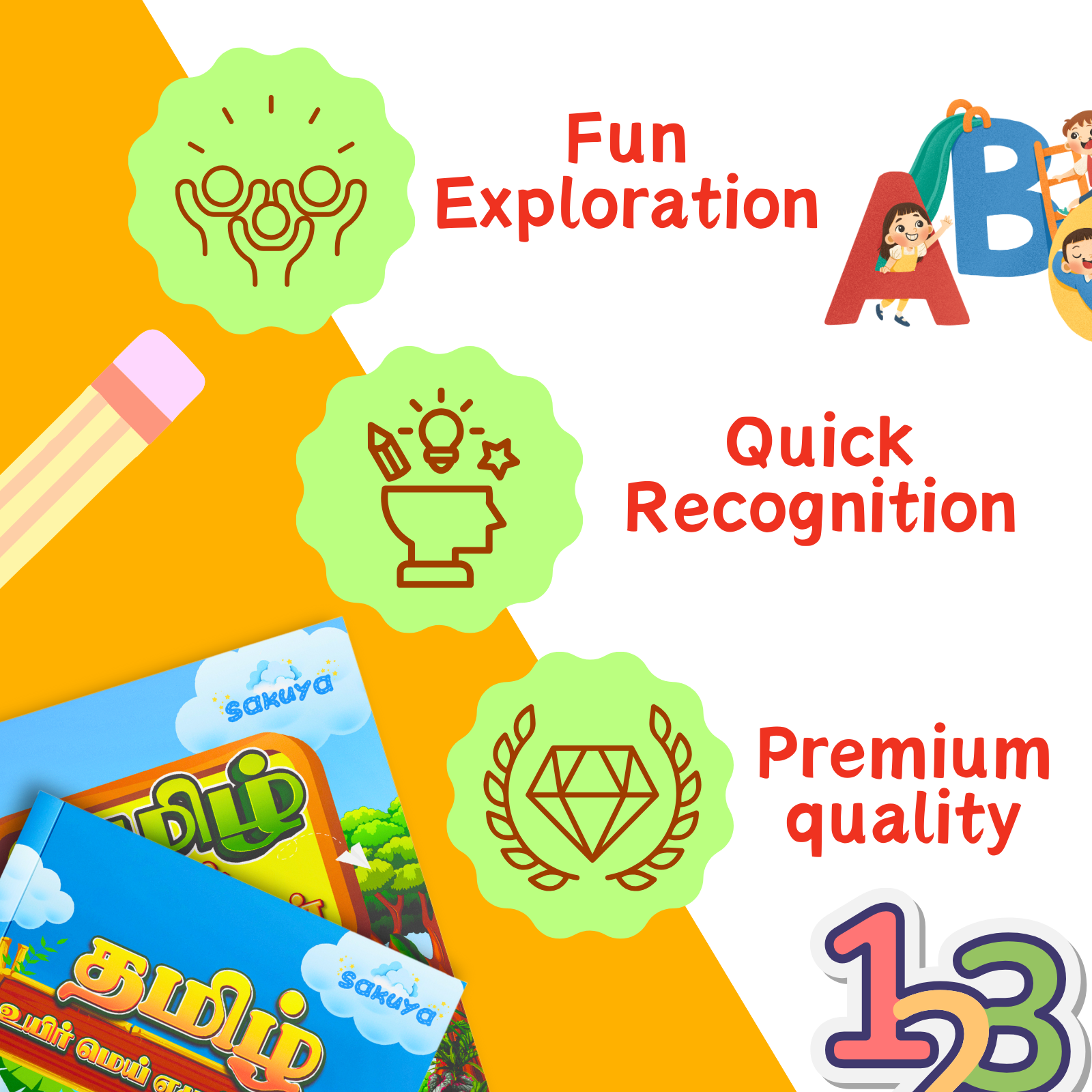 Help your child explore Tamil consonants (Mei Eluthugal) with this engaging learning book. Featuring 18 Tamil consonants, each letter is presented with illustrations, learning practice, and activities that make learning interactive and enjoyable. This book is designed for toddlers, preschoolers, and beginners, encouraging confidence in reading and writing while strengthening their Tamil foundation. Suitable for home learning, classrooms, and homeschooling Perfect for toddlers, preschoolers, and beginners, this book encourages early literacy, improves fine motor skills, and builds a strong foundation in Tamil. Ideal for home learning, classroom use, or homeschooling, it makes Tamil learning joyful and effective. Durable and child-friendly, this book is a wonderful way to connect kids with Tamil language and culture while making the learning process enjoyable